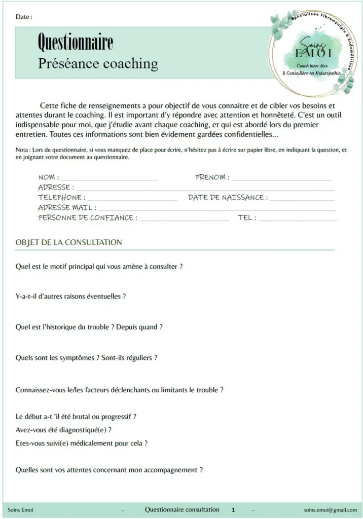 Lors de notre premier échange, j’évalue votre énergie vitale et fais le point sur votre problématique grâce à un questionnaire détaillé. Celui-ci est envoyé lors de la prise de rendez-vous ou téléchargeable directement.